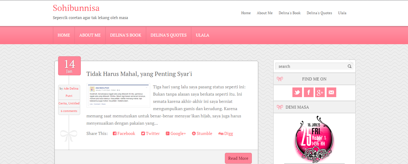 Blog Sohibunnisa ini memang jadi langkah awal saya dalam bidang menulis. Maka jadilah blog ini isinya bermacam-macam. Apapun yang mau saya ceritakan, saya tulis di sini. Kalau ada kutipan bagus dan nggak mau hilang, ya saya masukkan juga di blog ini. Kalau mau ikut lomba ya di sini tempatnya. Kalau ada review produk, ya di sini juga tempatnya :v Meski awalnya saya kurang PD dengan tulisan-tulisan sendiri, tapi lama kelamaan saya banyak belajar lewat komunitas-komunitas blog yang membuat saya mulai berani membagikan tulisan saya pada khalayak. So, jangan ada lagi tanya, “Blog Sohibunnisa tuh, blog tentang apa sih?” Pasti bakal saya jawab, “Apa aja!” Soalnya saya bingung juga harus jawab apa. Kalau memang kenyataannya nggak spesifik. Toh, deskripsi blog sendiri sudah menjelaskan, Sepercik coretan agar tak lekang oleh masa. Memang hanya coretan. Coretan tulisan yang mau saya abadikan.
