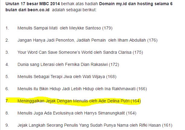 - Meninggalkan Jejak dengan Menulis – Mozaik Blog Competition (Juara favorit)