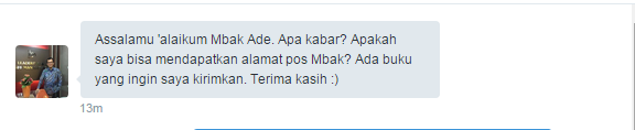 Kembali lagi. Yang membuat saya bahagia adalah, minggu lalu resensi saya dimuat lagi di Koran Jakarta. Kali ini saya meresensi buku Pak Arvan, I Love Monday. Dan saya mengikuti jejak teman-teman yang menandai resensinya ke penulis bukunya. Ya, hanya itu niat saya. Tapi berapa hari kemudian atau tepatnya hari ini, Pak Arvan tiba-tiba memfollow saya, dari sini saja saya sudah senang sekali. Ditambah menit berikutnya beliau mengirimkan direct message di atas. Bukan hanya karena mendapatkan buku, tapi karena penghargaan. Ya, saya merasa mendapat sebuah kehormatan. Saya merasa dihargai sekali. Sederhana memang. Bagi saya yang ‘masih anak baru’ merasa bahwa ini merupakan langkah awal yang bagus. Wajarlah karena sebelumnya saya belum pernah seperti ini.