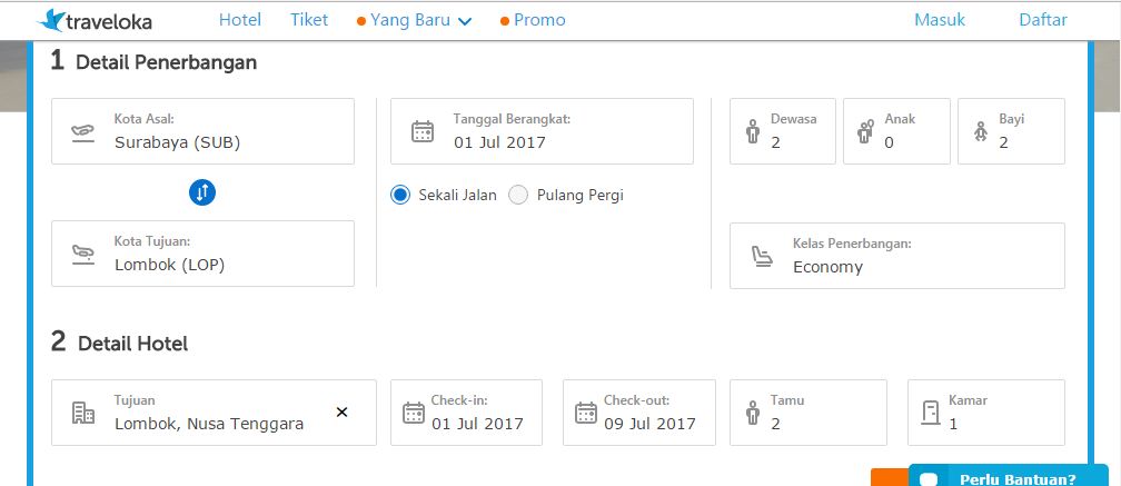 Saya sudah lihat di Traveloka, kalau mereka membuka pemesanan tiket plus hotel sebagai 1 paket! Saya coba buka disini. Misalnya saya coba order untuk saya dan suami, serta 2 bayi (anak saya sebentar lagi kan dua hehe).